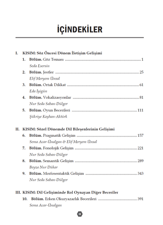 Kitabımızda 3 ana kısım ve altlarında yer alan toplam 10 bölüm mevcut. bu 10 bölüm 7 yazarın elinden çıktı. Kitapta söz öncesi dönem iletişim becerilerini, sözel dil gelişimini ve erken okuryazarlık gelişimini ayrıntılı biçimde okuyabilirsiniz. Tipik gelişim sürecini Türkçede yapılan araştırmalarla zenginleştirerek vermeye çalıştık, ayrıca özel popülasyonlarda bu becerilerin gelişiminin nasıl bir seyir gösterdiğini değerlendirme ve müdahaleye de yer vererek kitabımıza kattık. Ayrıca gururla belirtmeliyim ki kitabımızın ön sözünü Prof. Dr. İlknur Maviş hazırladı.